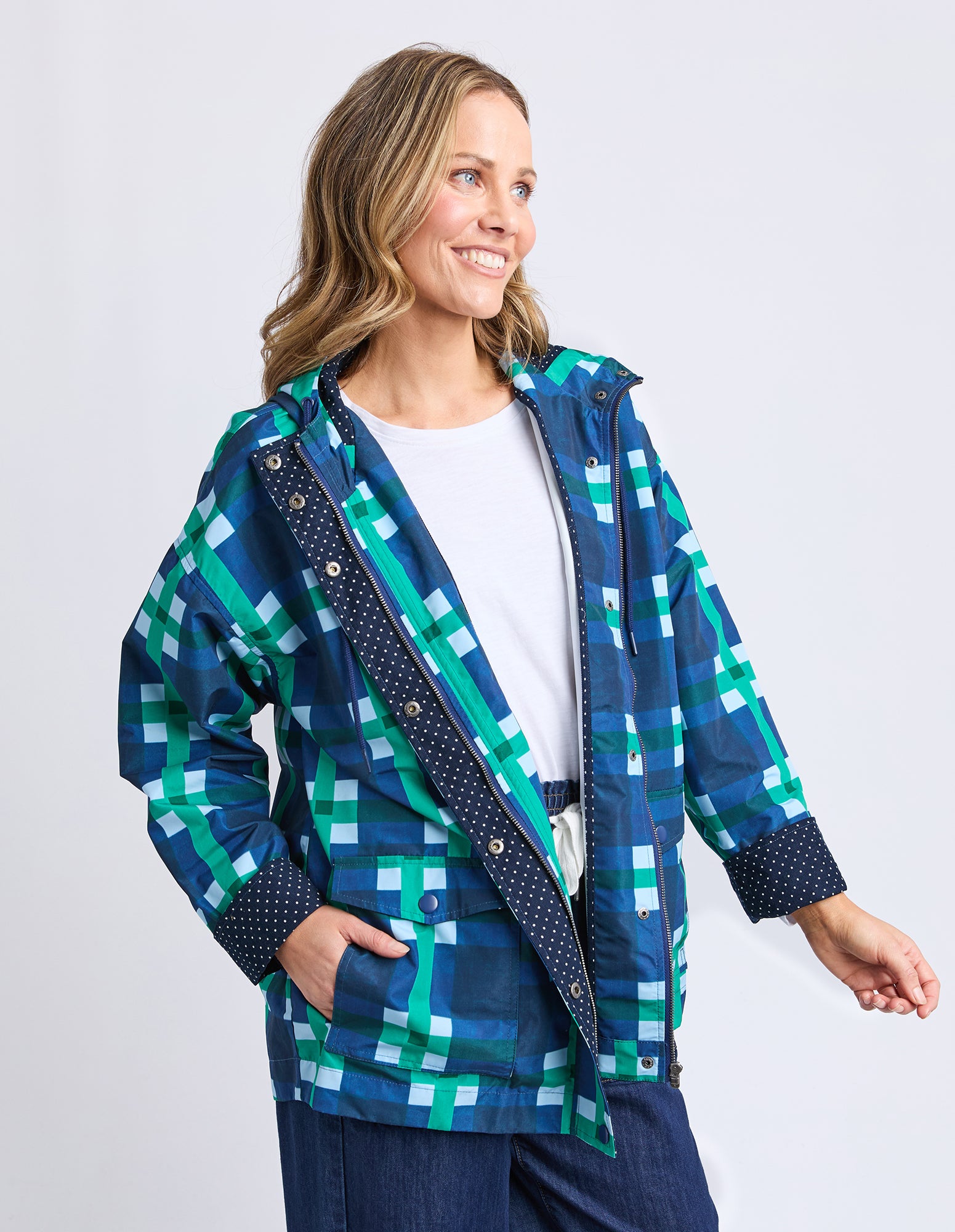 The Elm Bari Raincoat blends functional outerwear with statement style. Featuring exclusive Bari print artwork with a playful polka dot facing, this relaxed-fit raincoat is crafted from coated PVC and finished with practical front pockets—perfect for staying dry in style.