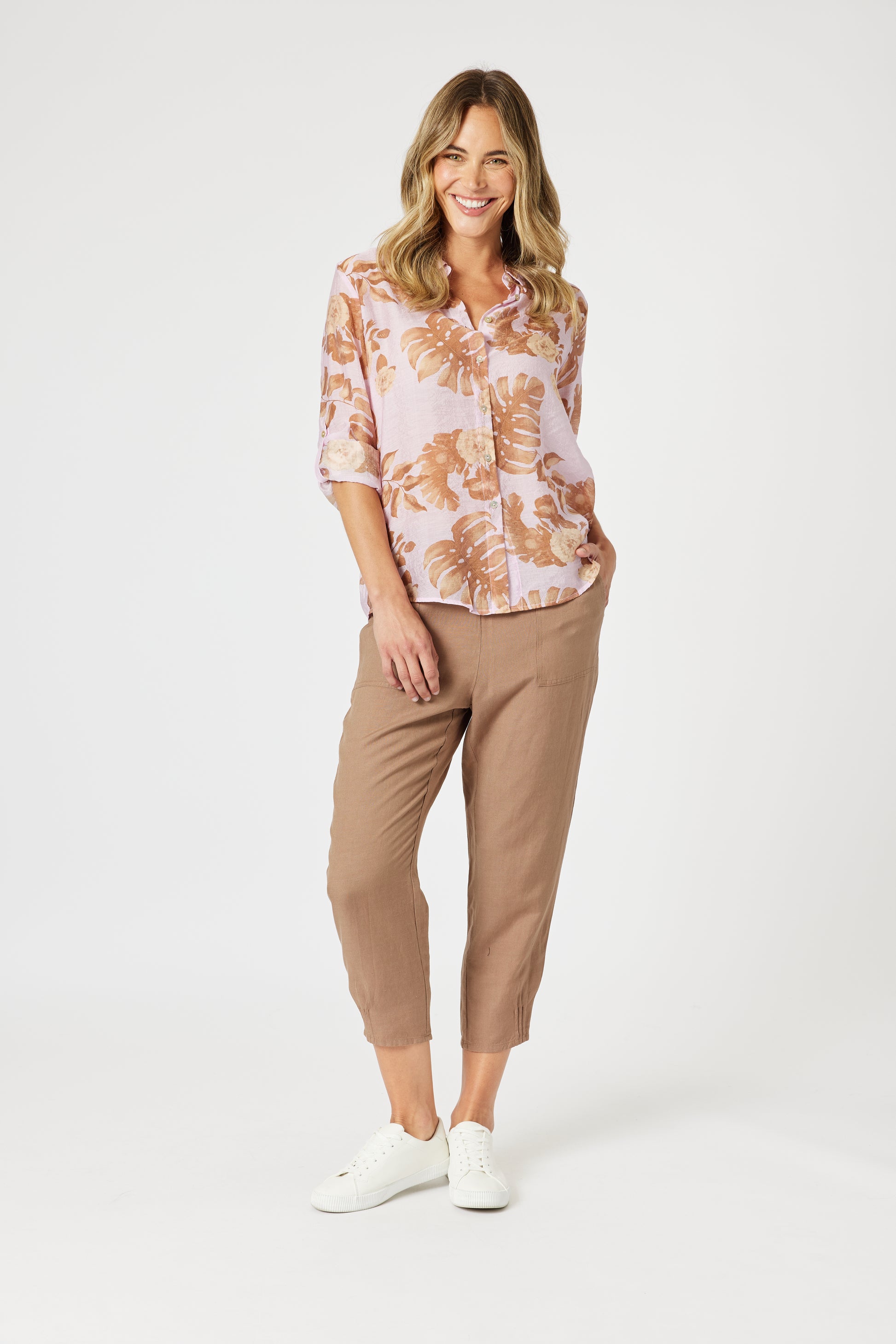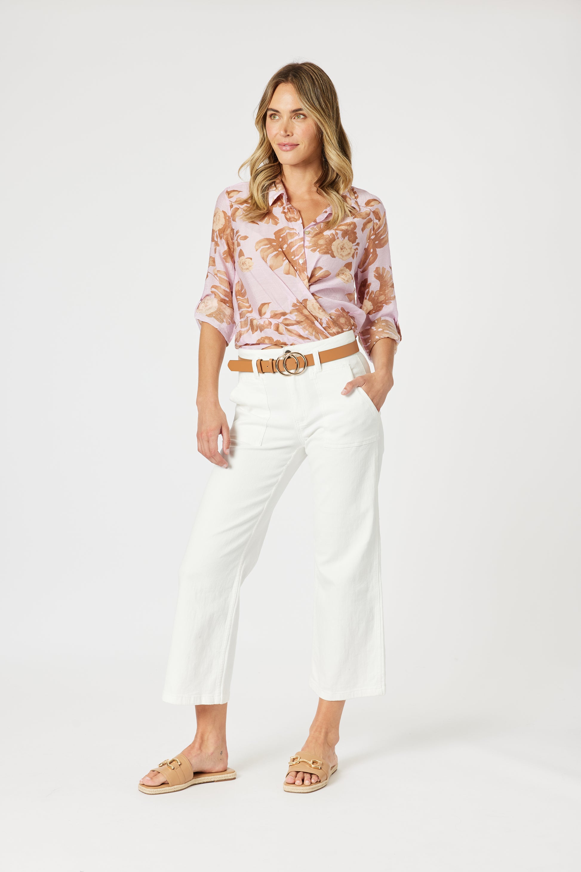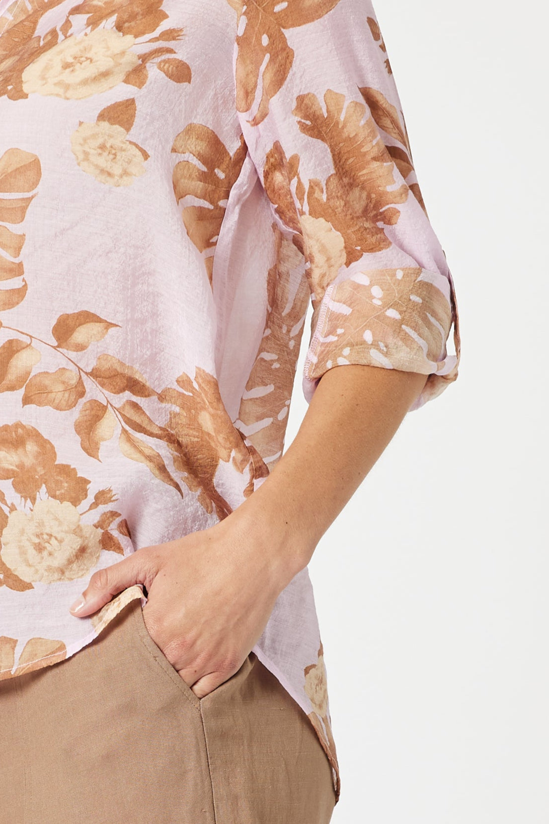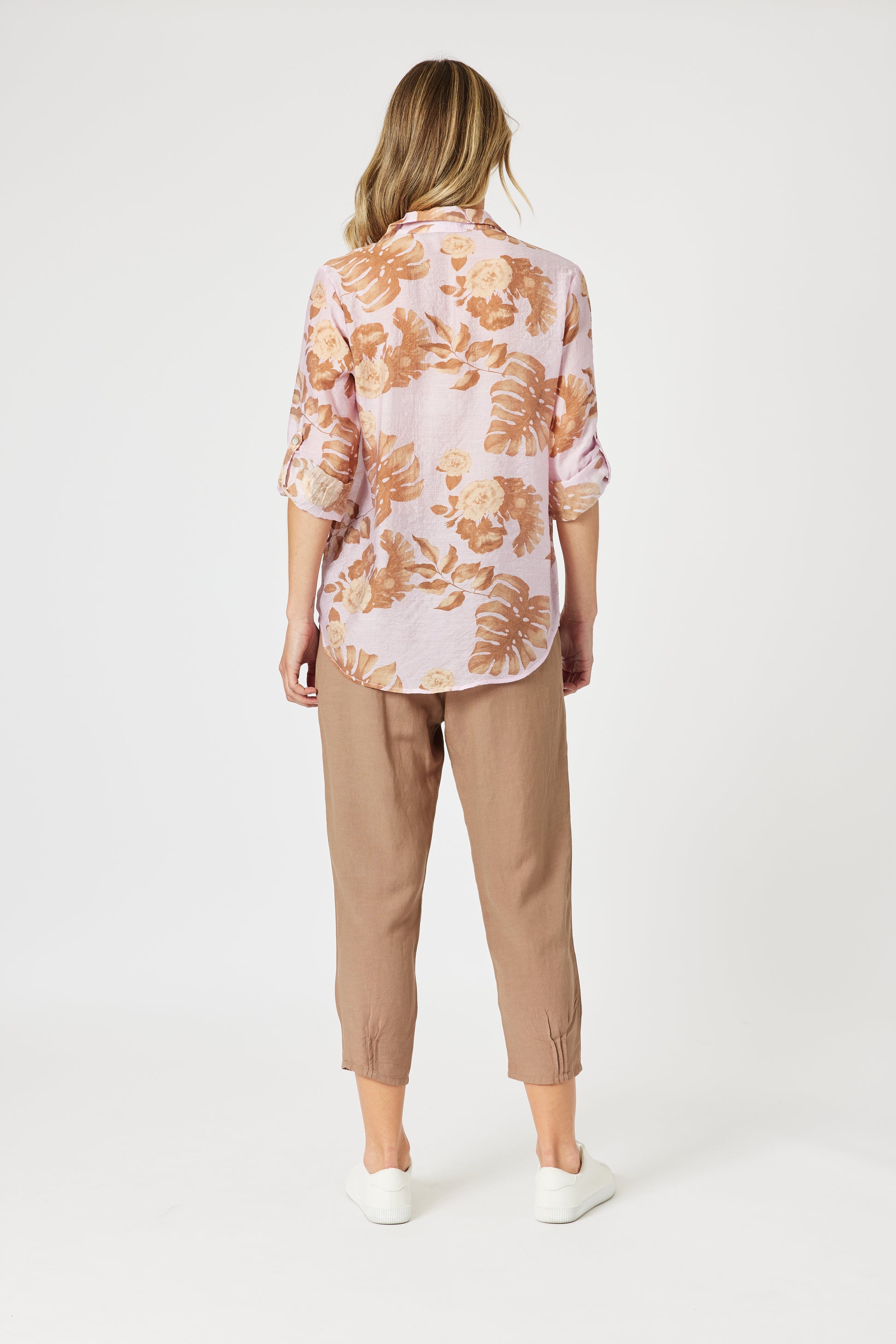 - Designed in a soft pink base with a bold tropical floral print, it’s the perfect piece to brighten up your wardrobe.