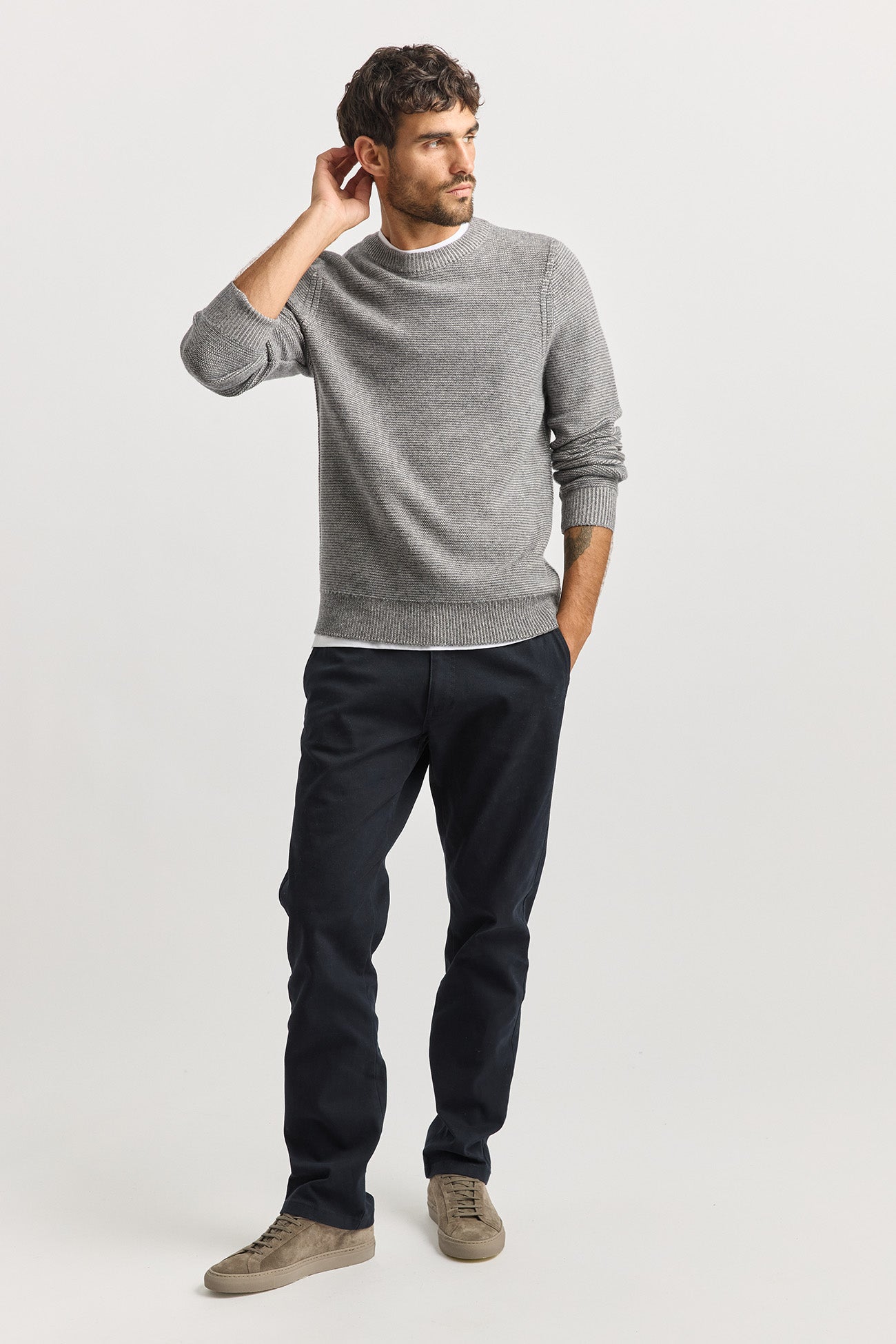 The Links Stripe Crew is a warm, medium weight knit with a subtle two tone textured stitch. The crew neck, wrists, and waistband are detailed with a fine rib trim.