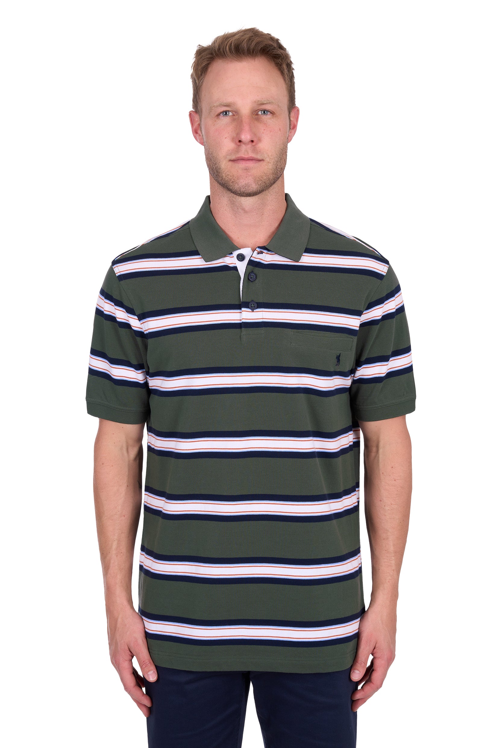 Concealed chest pocket, multi colour stripe design, rib collar and cuffs, premium quality canvas taping on front placket, contrast herringbone taping on inner neck and side seam splits, contrast button thread colour to match stripes, horseman embroidery on chest