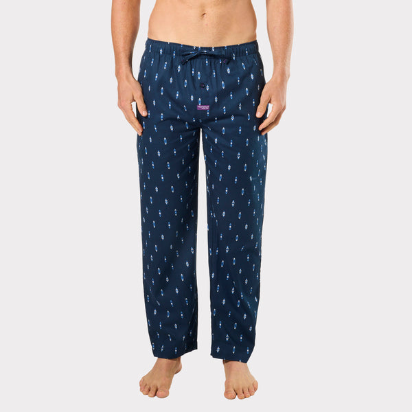 Hang out with Mitch in our best selling Classic Mens Flint Cotton Printed Woven Pyjama Pants in navy. Lovingly crafted from 100% Cotton Twill these pants are super comfortable and breath beautifully. These pyjama pants are designed by us featuring our own fabulous original design, a covered elastic waist with drawstring fastening, side pockets and a single button fly. They are perfect for bed or lounging around on the weekend. Pair with any MD sleep tee for the complete look.